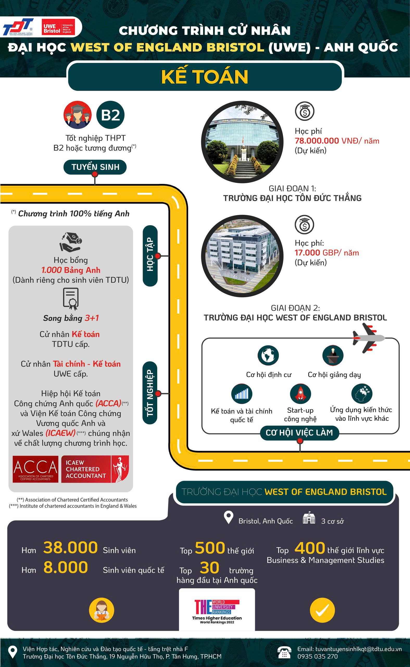 Tấm bằng cử nhân Kế toán - Chương trình tiên tiến tại TDTU sẽ là thẻ thông hành để bạn làm việc bất cứ nơi nào trên thế giới. Các vị trí nghề nghiệp về tài chính, kế toán, kiểm toán, tư vấn tài chính, tư vấn thuế, quản trị rủi ro, kiểm soát nội bộ… tại bất kỳ ngành nghề và lĩnh vực nào từ các cơ quan nhà nước, doanh nghiệp trong nước và quốc tế, công ty đa quốc gia, tổ chức tài chính (ngân hàng, chứng khoán, bảo hiểm, quỹ tài chính), tổ chức phi chính phủ cũng như quản lý doanh nghiệp gia đình.